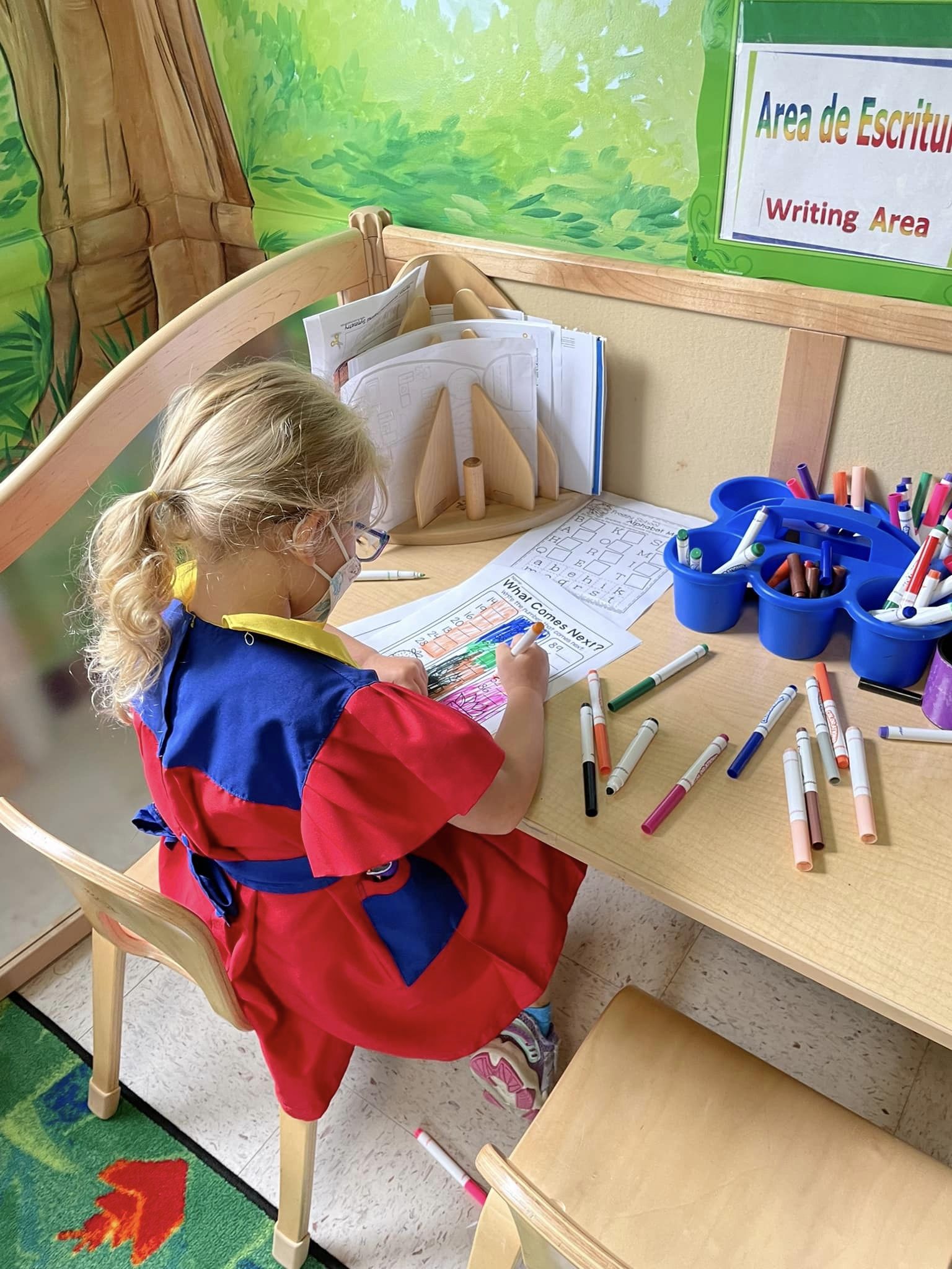 Our 2 – 3’s, 2.5 – 3’s, and 3 – 4’s programs are 100% Spanish immersion, 5 days a week. Our pre-kindergarten and kindergarten programs are 3 days of Spanish instruction and 2 days of English instruction.